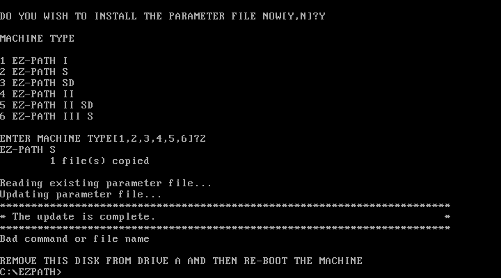 Follow the prompts confirming by pressing “Y” on the keyboard until DOS is successfully installed. It will prompt you to remove the disk and install the CNC software.