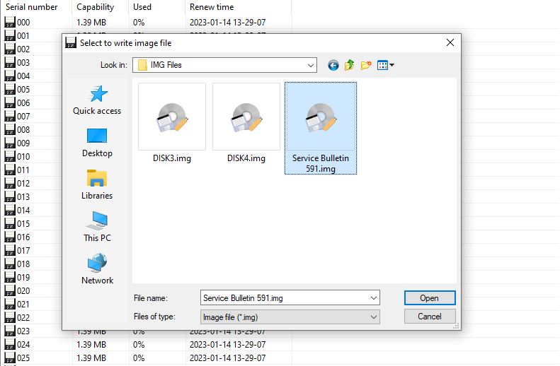 Navigate to the extracted disk images, and select the “Service Bulletin 591” IMG file, and click open.